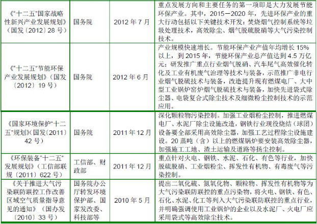 根據(jù)《國務(wù)院關(guān)于印發(fā)大氣污染防治行動(dòng)計(jì)劃的通知》(國發(fā)〔2013〕37號(hào))的要求,到2017 年,全國地級(jí)及以上城市可吸入顆粒物濃度比2012 年下降10%以上;京津冀、長三角、珠三角等區(qū)域細(xì)顆粒物濃度分別下降25%、20%、15%左右;加快重點(diǎn)行業(yè)脫硫、脫硝、除塵改造工程建設(shè)。所有燃煤電廠、鋼鐵企業(yè)的燒結(jié)機(jī)和球團(tuán)生產(chǎn)設(shè)備、石油煉制企業(yè)的催化裂化裝置、有色金屬冶煉企業(yè)都要安裝脫硫設(shè)施,每小時(shí)20 蒸噸及以上的燃煤鍋爐要實(shí)施脫硫。除循環(huán)流化床鍋爐以外的燃煤機(jī)組均應(yīng)安裝脫硝設(shè)施,新型干法水泥窯要實(shí)施低氮燃燒技術(shù)改造并安裝脫硝設(shè)施。燃煤鍋爐和工業(yè)窯爐現(xiàn)有除塵設(shè)施要實(shí)施升級(jí)改造;京津冀、長三角、珠三角等區(qū)域要于2015 年底前基本完成燃煤電廠、燃煤鍋爐和工業(yè)窯爐的污染治理設(shè)施建設(shè)與改造,完成石化企業(yè)有機(jī)廢氣綜合治理。